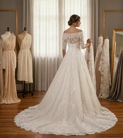 Construção de um vestido de noiva ao vivo com uma noiva real
